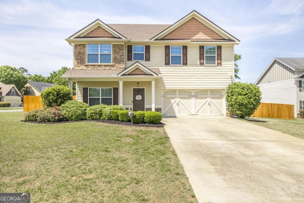 Welcome home to this beautifully maintained property perfectly positioned on a spacious corner lot. Designed with both comfort and functionality in mind, this home offers the ideal blend of everyday living and effortless entertaining. Step inside to find a generous formal dining room alongside a bright, open kitchen featuring a large island, abundant cabinetry, and plenty of prep space. Granite countertops, a built-in trash feature, and included refrigerator make this kitchen as practical as it is inviting. The expansive great room showcases warm wood flooring and a cozy fireplace, creating the perfect space to gather and unwind. Upstairs, all bedrooms are thoughtfully tucked away, including a spacious primary suite complete with dual closets and a well-appointed bath featuring separate vanities, a soaking tub, and a walk-in shower. This home checks all the boxes space, style, and value. Don't miss your chance to make it yours!